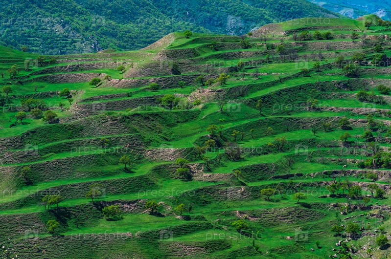 Горный пейзаж с зелеными сельскохозяйственными террасами на склонах