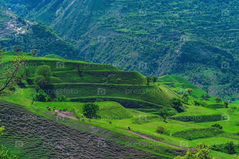 Горный сельский пейзаж с террасными пастбищами и пасущимся стадом
