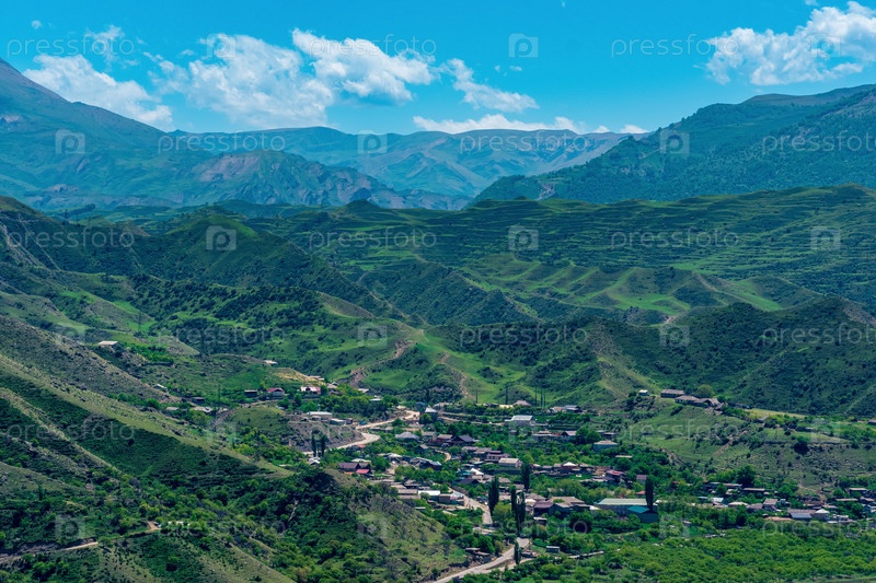 Деревня в долине среди гор с террасными полями, село Чох в Дагестане, Северный Кавказ