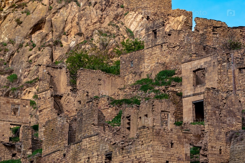 Руины каменных домов, прикрепленных к скале в безлюдной деревне Гамсутль в лучах заката