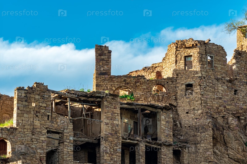 Руины каменных домов, прикрепленных к скале в безлюдном селе Гамсутль в Дагестане