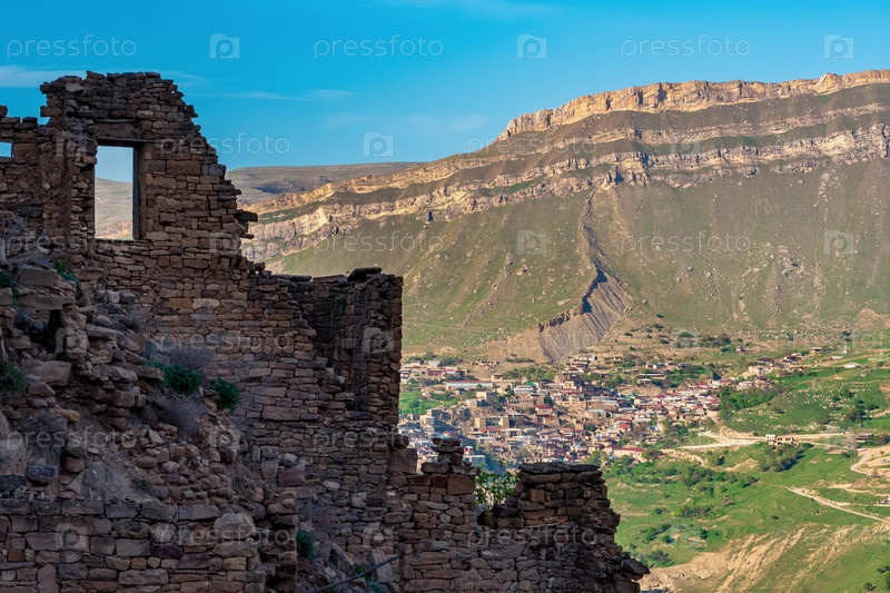 Стены заброшенных домов на горном обрыве в деревне-призраке Гамсутль в Дагестане, на противоположной стороне долины видно жилое село Чох