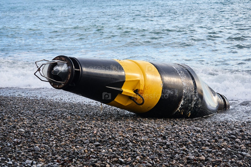 Поврежденный морской буй - знак кардинальной опасности - выброшен на берег после шторма