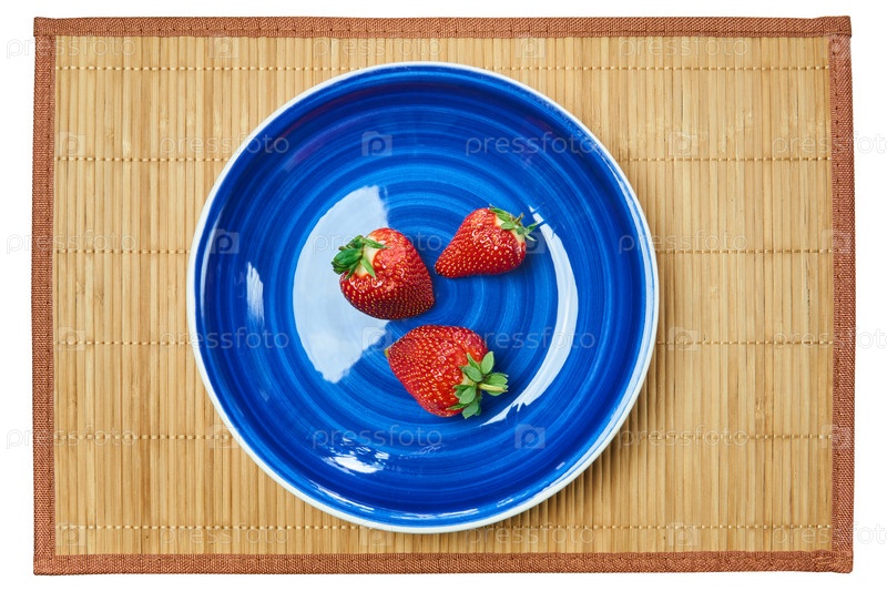Три клубники на синей тарелке на тростниковом коврике