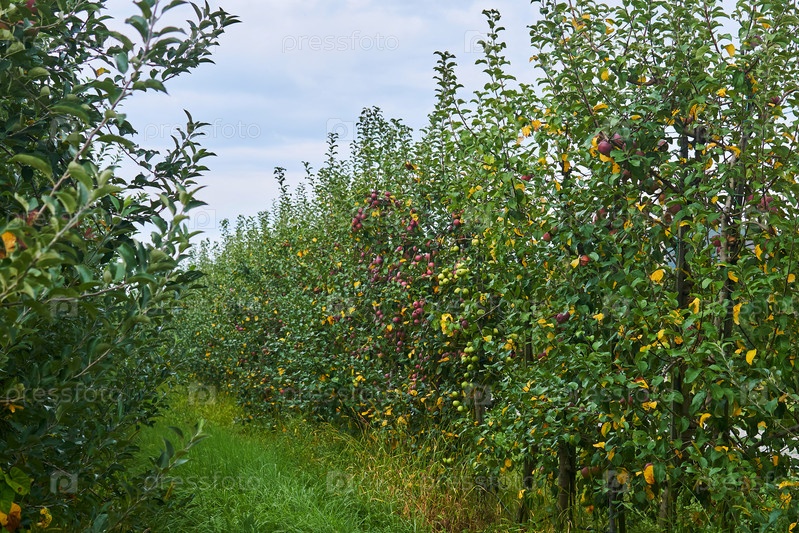Ряды молодых фруктовых деревьев в яблоневых садах