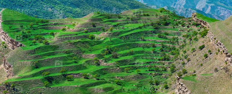 Горный пейзаж с зелеными террасными сенокосами на склонах