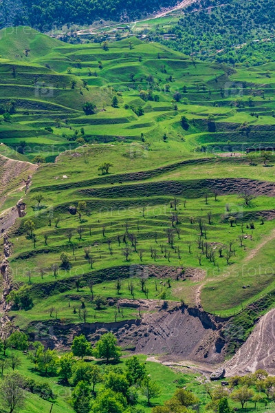 Террасные сельскохозяйственные угодья на склонах гор в Дагестане