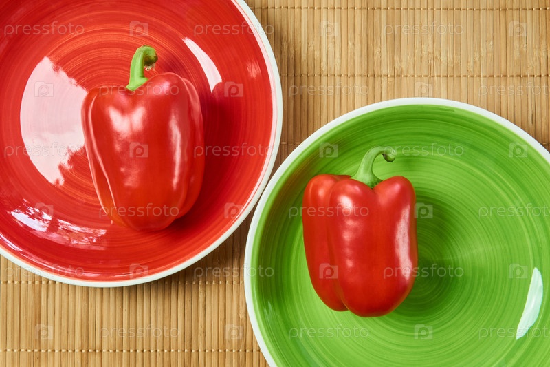 Два стручка сладкого перца на двух тарелках - красном и желтом - на тростниковой подставке