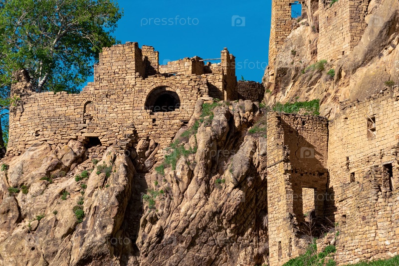Руины старого каменного дома под деревом в историческом заброшенном селе Гамсутль в Дагестане