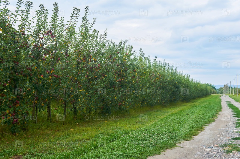 Яблоневые сады рядом с грунтовой дорогой в сельской местности