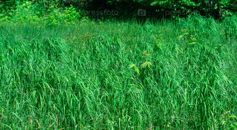Болотный луг с зеленой травой, освещенной солнцем