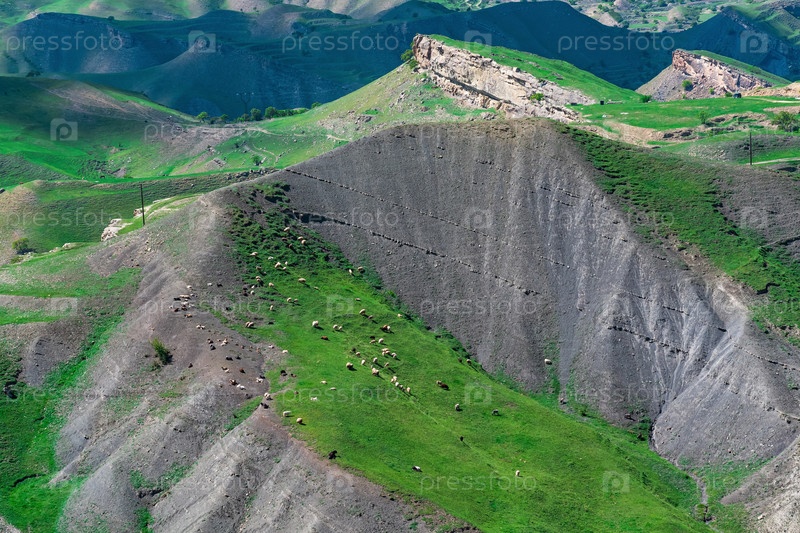 Альпийское пастбище со стадом овец, вид с воздуха