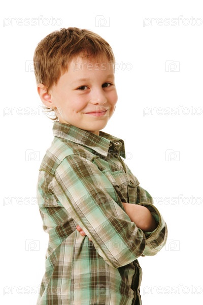 Портрет улыбающегося мальчика, смотрящего в камеру на белом фоне