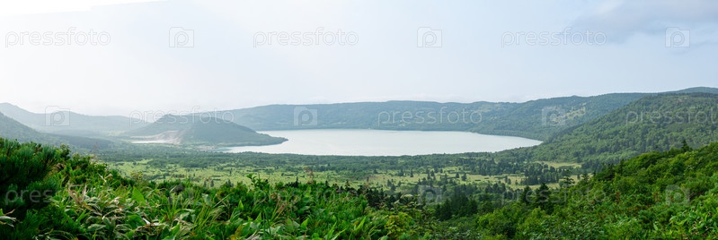 Природный ландшафт острова Кунашир, вид на кальдеру вулкана Головнина с горячими озерами