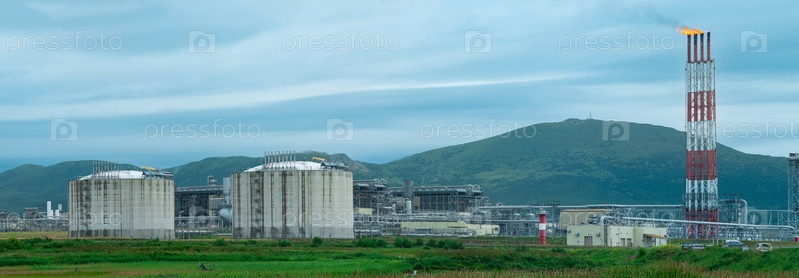 Завод по производству сжиженного природного газа на природной территории на фоне гор