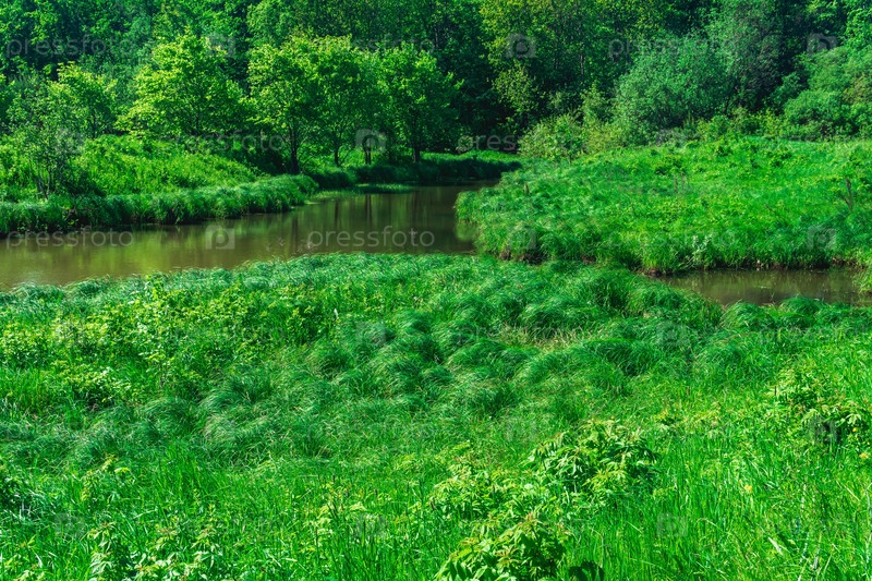 Небольшая лесная речка между берегами с болотистыми лугами