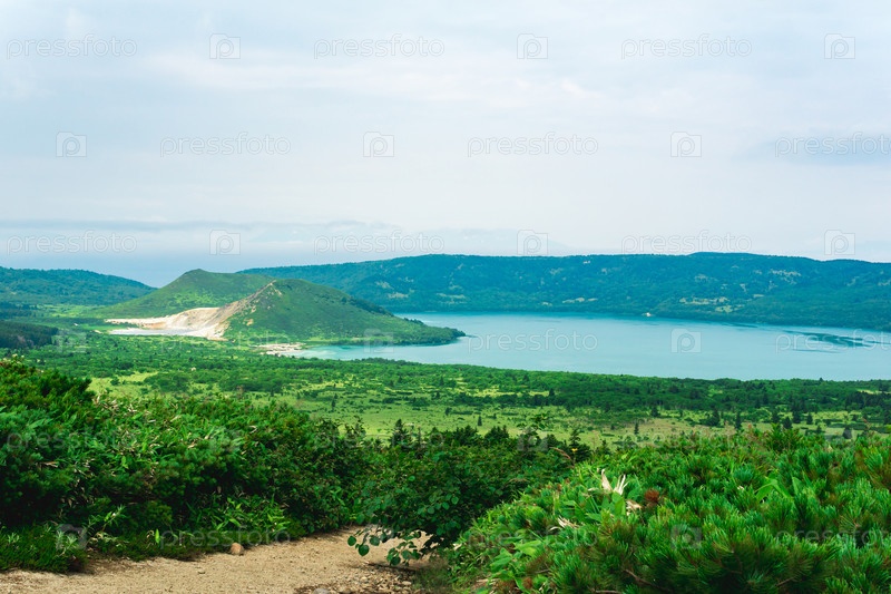 Природный ландшафт острова Кунашир, вид на кальдеру вулкана Головнина с горячими озерами и тропинку через заросли сасы и карликовых сосен на переднем плане
