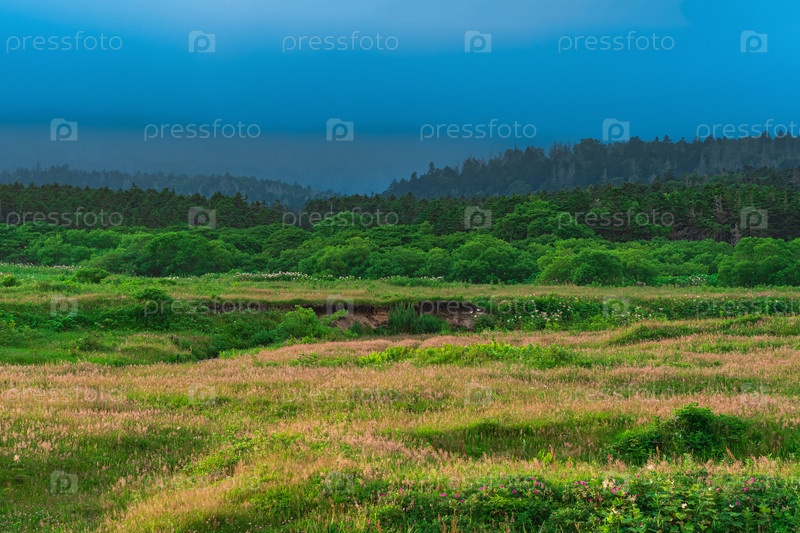 Природный ландшафт острова Кунашир с низкими дождевыми облаками, покрывающими горы на заднем плане
