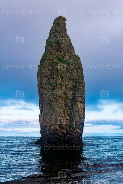 Морской пейзаж Кунашира, берег океана с огромной вертикальной скалой в воде