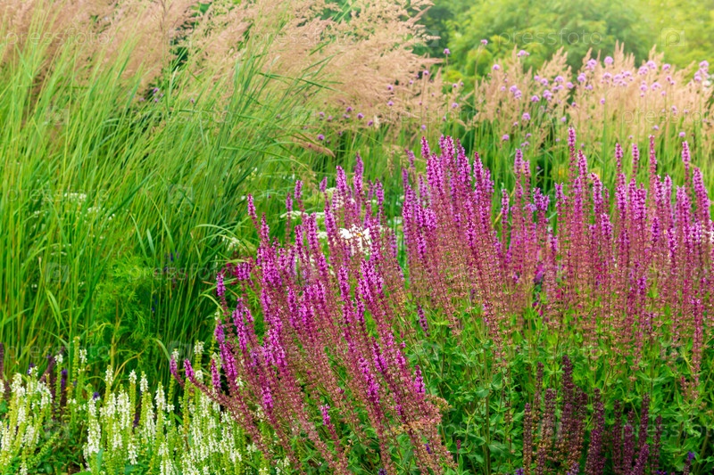 Фон - клумба с различными цветами и травами, ландшафтный дизайн
