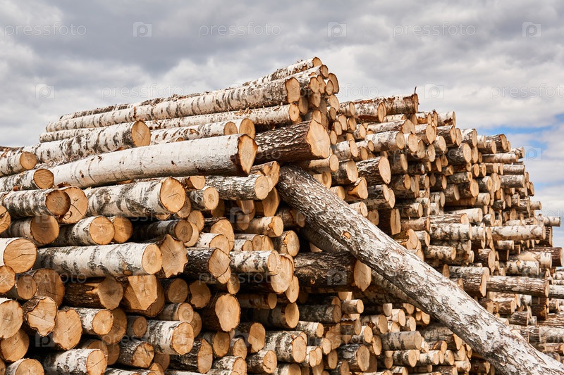 Много березовых бревен складывают на складе перед обработкой или транспортировкой