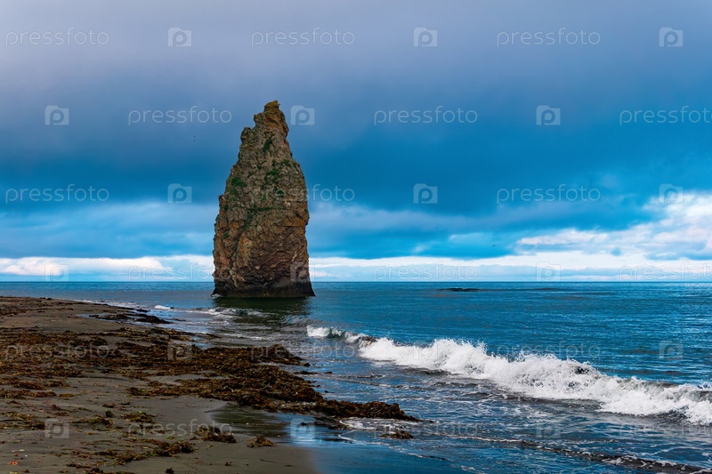 Морской пейзаж Кунашира, берег океана с огромной вертикальной скалой в воде и дикий пляж с водорослями, выброшенными морем