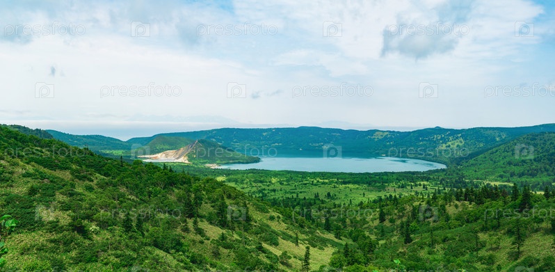 Природный ландшафт острова Кунашир, вид на кальдеру вулкана Головнина с горячими озерами