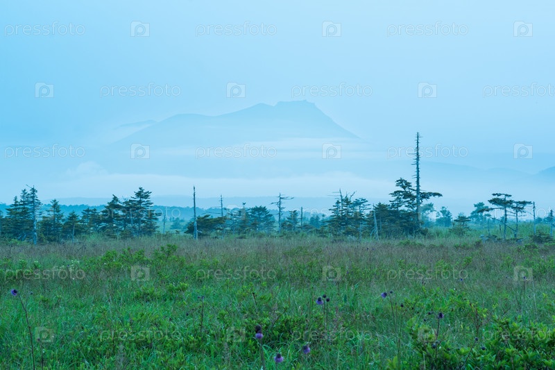 Туманный утренний пейзаж на острове Кунашир с видом на вулкан