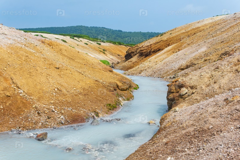 Горячий поток сероводорода среди берегов вулканического пепла и тефры в кальдере вулкана Головнина, остров Кунашир