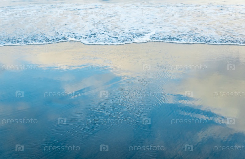 Океанский пляж с возвращающейся волной, в которой отражается небо