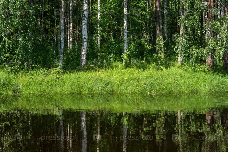 Природный ландшафт, травянистый лесистый берег озера, вид с воды в солнечный день