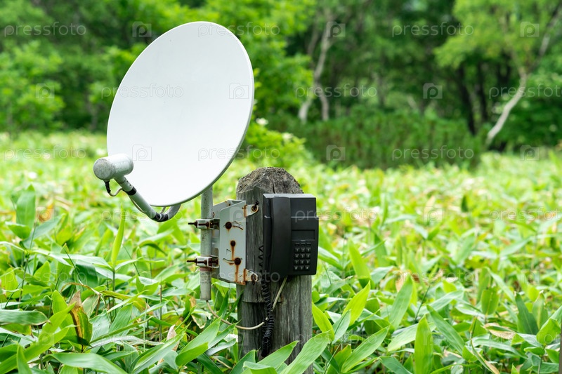 Общественный спутниковый телефон для экстренной связи среди бамбуковых зарослей в дикой местности заповедника