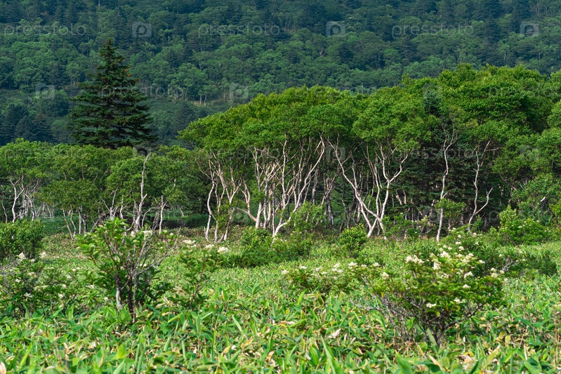 Каменные березы среди бамбуковых зарослей, лесной ландшафт острова Кунашир, муссонный прибрежный лес