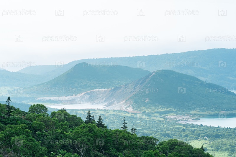 Природный ландшафт острова Кунашир, вид на кальдеру вулкана Головнина с горячими озерами