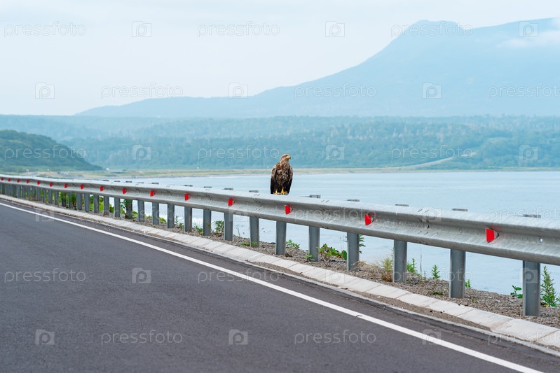 Серый орлан сидит на дорожном барьере на краю прибрежного шоссе на фоне туманной бухты, остров Кунашир