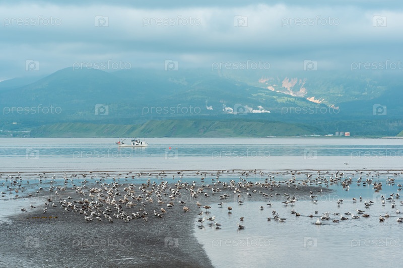 Чайки на мелководье во время отлива на фоне морского залива с туманным вулканом вдалеке, пейзаж возле города Южно-Курильска на острове Кунашир