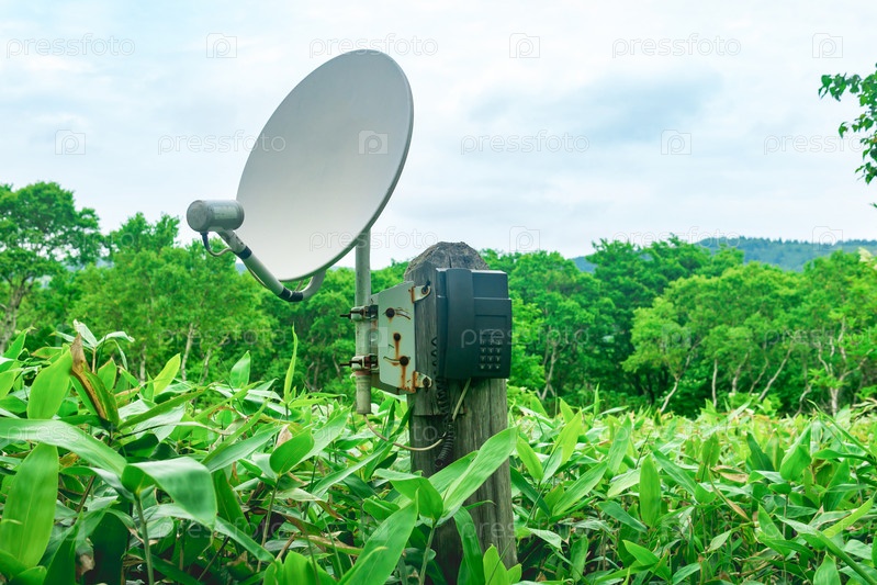 Общественный спутниковый телефон для экстренной связи среди бамбуковых зарослей в дикой местности заповедника