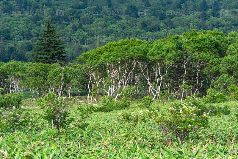 Каменные березы среди бамбуковых зарослей, лесной ландшафт острова Кунашир, муссонный прибрежный лес