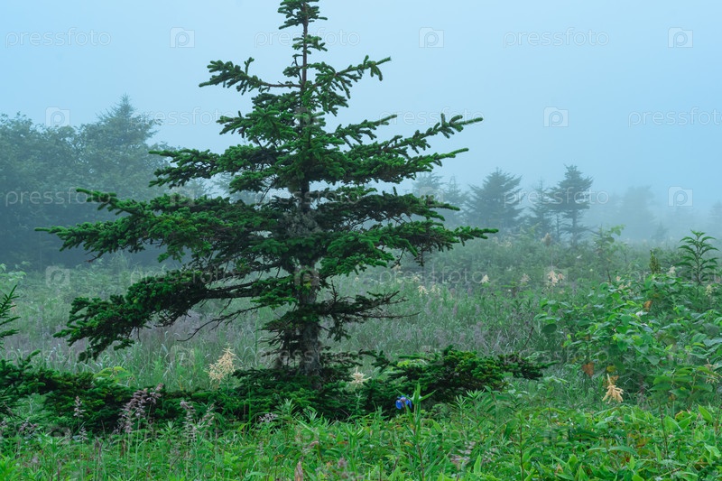 Туманный утренний пейзаж на острове Кунашир с видом на вулкан