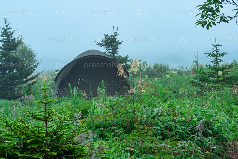 Туристическая палатка среди растительности в туманном утреннем пейзаже