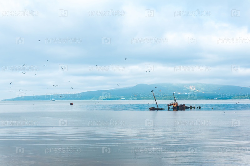 Кораблекрушение на фоне морского залива с туманными горами на заднем плане