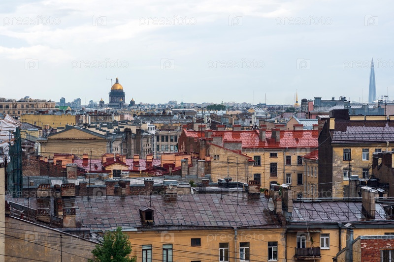 Вид сверху на городские крыши в историческом центре Санкт-Петербурга с дождливым небом