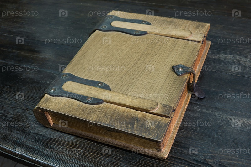 Старый журнал в деревянном футляре с застежками на черной столешнице, закрытый