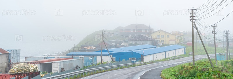 Вид на поселок Южно-Курильск на острове Кунашир во время тумана