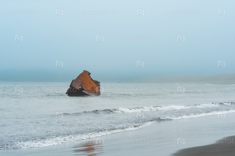 Ржавое кораблекрушение, обломки корабля у побережья на фоне туманного моря