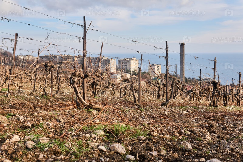 Сухие зимние обрезанные лозы в винограднике на фоне прибрежного города
