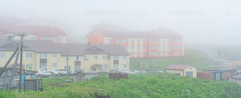 Вид на поселок Южно-Курильск на острове Кунашир во время тумана