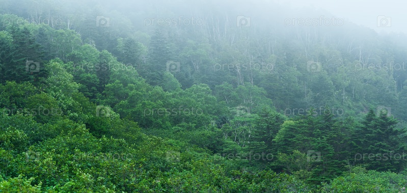 Туманный горный лес на склоне вулкана на острове Кунашир