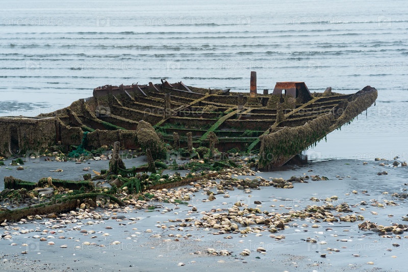 Остатки разбитого корабля на туманном берегу моря