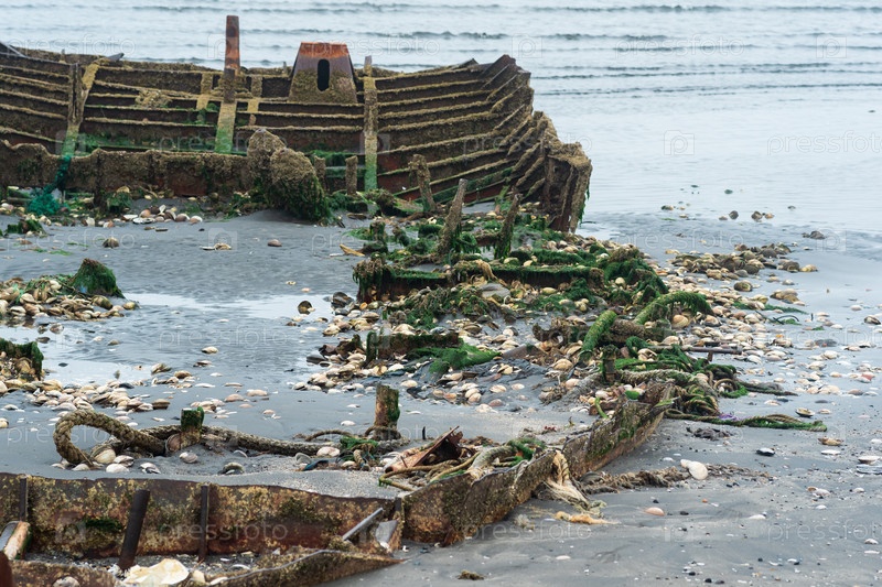 Остатки разбитого корабля на туманном берегу моря